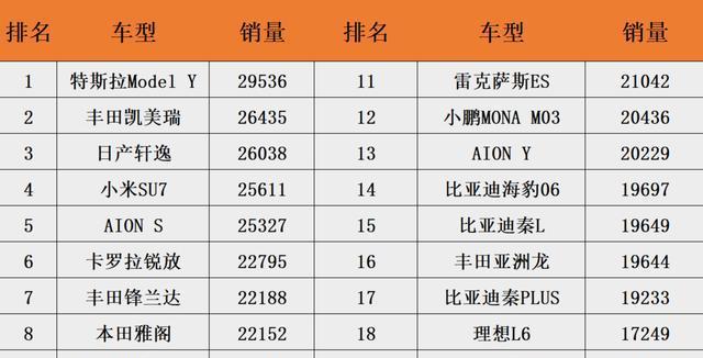 排名前五的车型分别是特斯拉Model Y、丰田凯美瑞、日产轩逸、小米SU7以及AION S,其中排名榜首的特斯拉Model Y卖出了29536辆,优势较为明显,其余四款车型月销量分别为26435辆、26038辆、25611辆和25327辆,差距并不大。